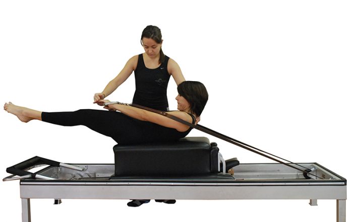 • instructora-de-sane-fisio-y-pilates-en-madrid-guiando-a-alumna-en-maquina-reformer--favoreciendo-la-conciencia-del-movimiento-y-la-correccion-postural
